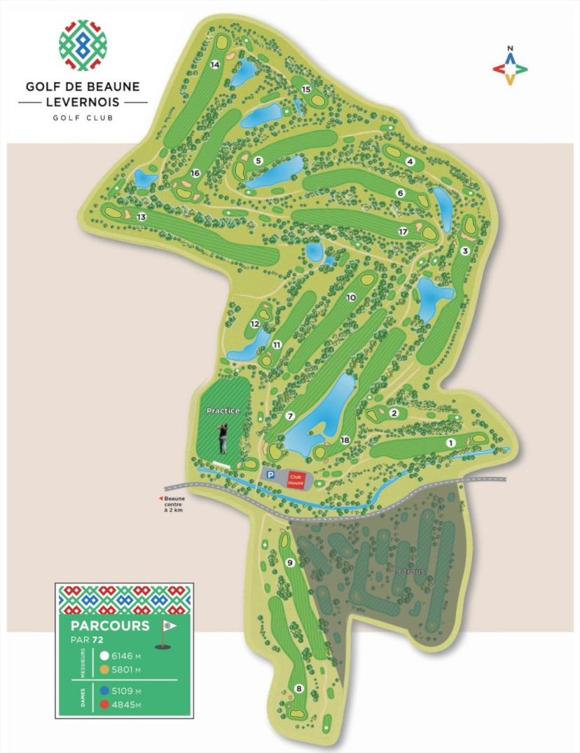 Le parcours de golf de Beaune Levernois s'étend sur 18 trous, comprenant des milliers d'arbres plantés ainsi qu'un nombre approprié de bunkers et 9 lacs. Avec une longueur de 6063 mètres, ce parcours est à la fois considérable et technique, mais reste accessible à tous les niveaux grâce à ses départs avancés.